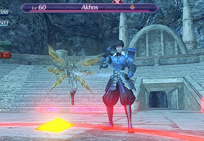 Akhos eventually bonds with a new Blade, Obrona. Using Obrona's powers, he is able to pinpoint Pyra's location and deduces that Nia is traveling with them. Jin sends him and Malos after the party. Akhos first makes his entrance in Garfont Village and attacks the party. Using Obrona's power, he is able to control the ether flow in the air, though Roc and Vandham disturb the ether flow, prompting him to escape.