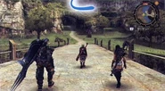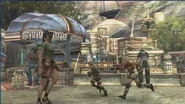 At the central plaza, Shulk and Reyn are forced to hold the Mechon off so that Fiora can get to the Mobile Artillery and refuel it using their Ether Cylinders. Just as the two warriors seem to be outmatched, Dunban, wielding the Monado again, cuts a swath through the Mechon and assists them in battle. They attempt to follow Fiora, but a large Mechon blocks the way with debris. The three resolve to circle around the colony to reach the Residential District.