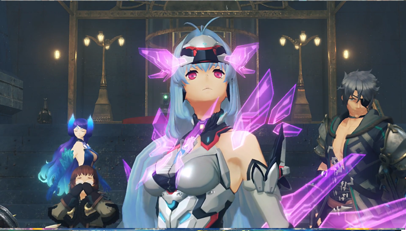 KOS-MOS is an android by name but a standard young lady Blade by all else. She is relatively short and muscular; by Xenosaga canon she should have physique identical to T-elos, however this is not true in Xenoblade Chronicles 2. Otherwise her appearance is very similar to her original; she has fair skin, large magenta eyes, and pastel blue hair that falls past her waist. She wears sci-fi style white armor plating on her legs, arms, and torso, with black, red and blue detailing. One of her arms is black, matching her neck brace. She also wears a large white, black, and red helmet which cover her forehead. When fighting, pink energy structures - similar to T-elos' purple ones - appear around her waist, shoulders, forehead and core crystal.