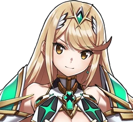 Mythra is a young woman with long blonde hair with the same styled bangs as Pyra, fair skin and golden eyes. She has an identical figure to Pyra; taller than Rex but still relatively short. After resonating with Rex, Mythra's cross-shaped Core Crystal loses its center, leaving a X-shaped gap behind. Mythra wears a short white dress with back accents and numerous golden and green ornaments, and a golden tiara. She has two green symmetrical crosses on her chest armor, differing from Pyra's single cross. Mythra's weapon is a large, jagged white sword which emits yellow-green ether energy when activated.