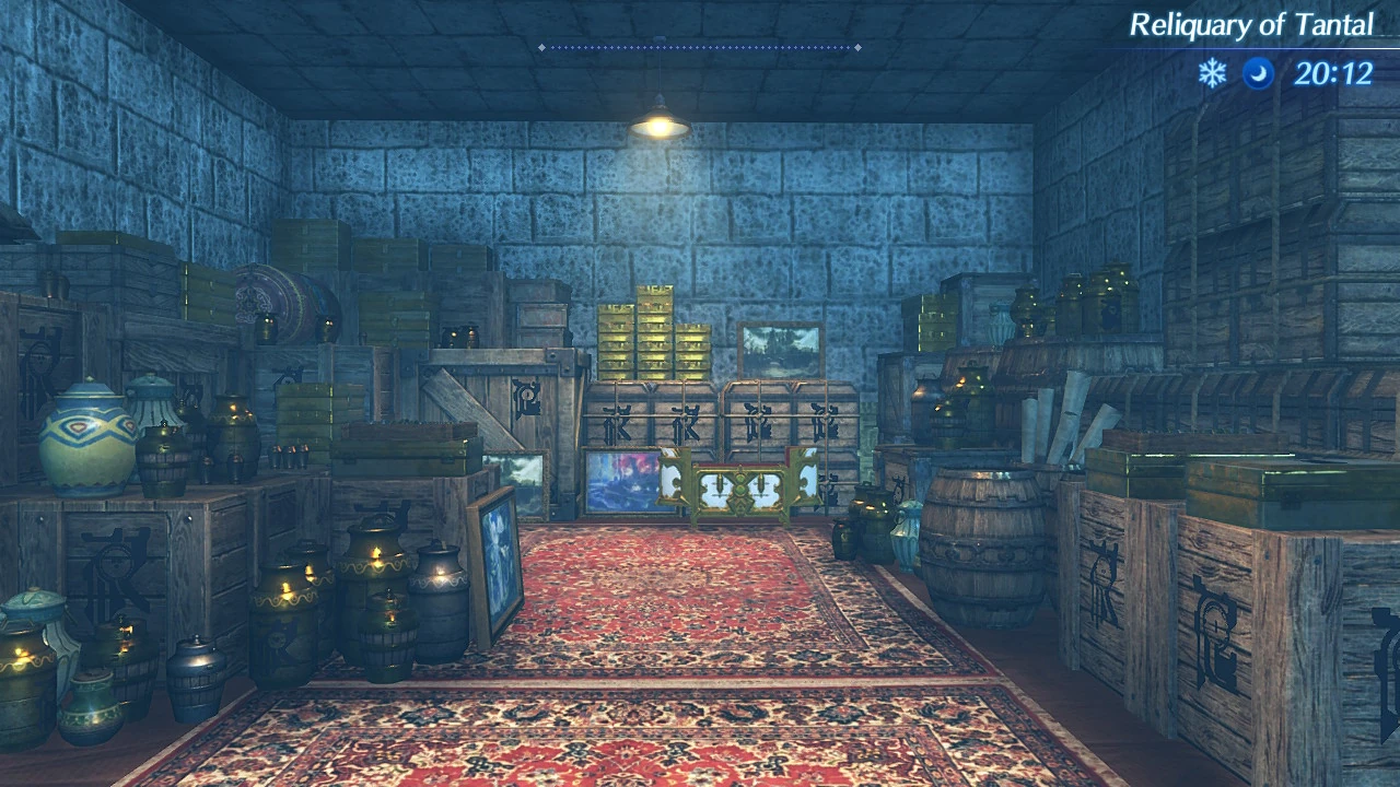 The Reliquary of Tantal (Japanese: ルクスリア聖遺物宝物庫, Rukusuria Seiibutsu Hōmotsuko) is a Location in Xenoblade Chronicles 2. It is located at the bottom of a staircase on the north side of the Hall of Virtue in Theoscaldia Palace, Tantal. Opening the door to the Reliquary requires Lockpicking Lv.7 and Ancient Wisdom Lv.5 Field Skills.