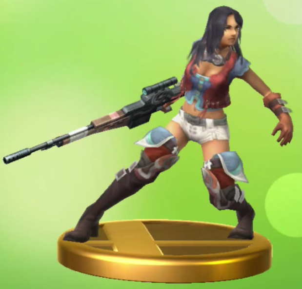 Her standard outfit consists of a blue crop top with short rippled sleeves and four square golden button-like jewels in front, an orangish red waistcoat with three rifle bullets in the pockets, a pair of silver goggles with dark brown straps, white shorts, a grey belt, brown elbow-length gloves with dark brown straps and silver buckles, and a pair of dark brown knee-high boots with blackish brown soles, silver buckles on the straps, and blue stockings pulled over the top of them.