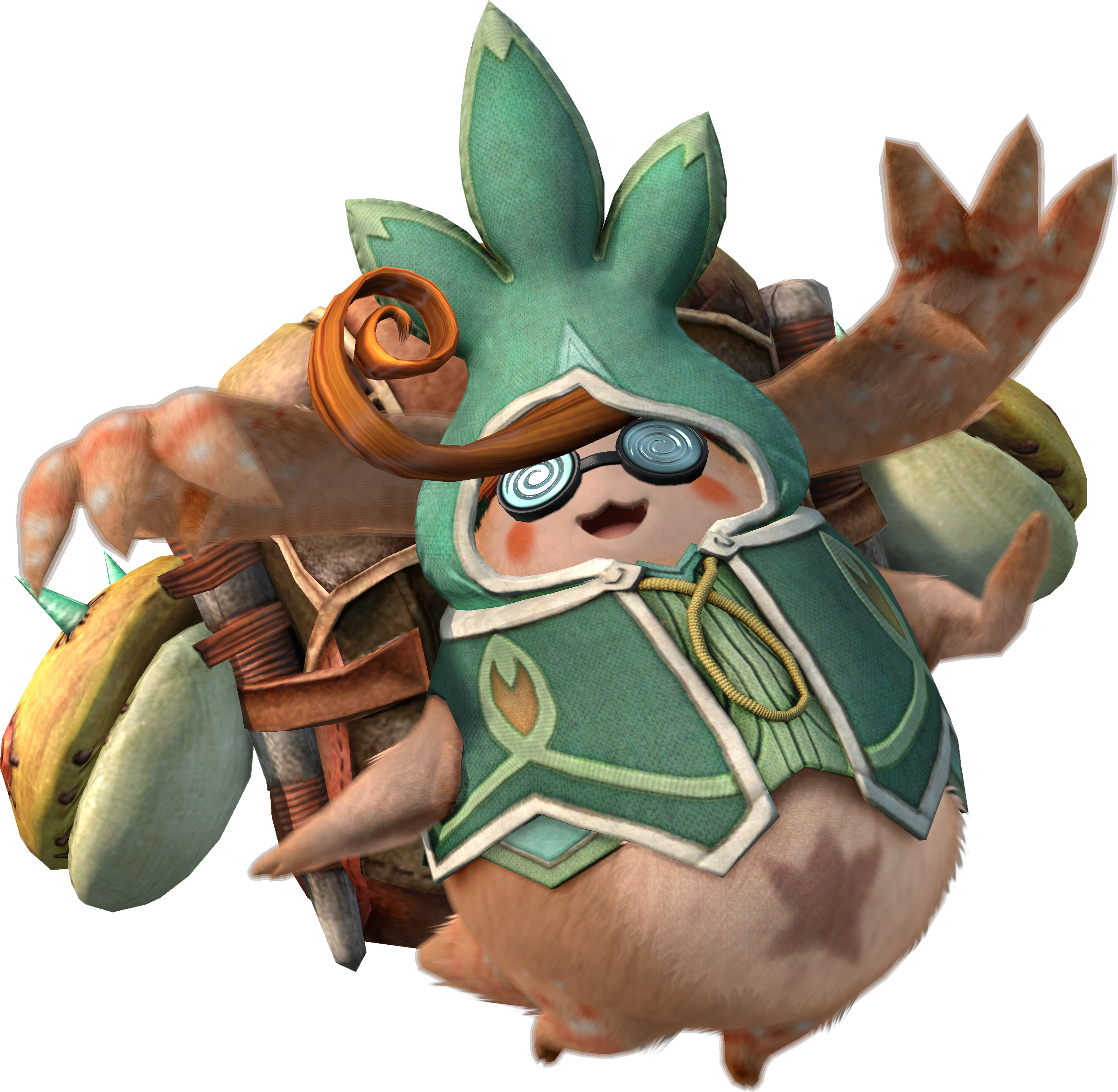 Tatsu is a male Nopon with orange and brown fur. He has brown hair that swirls to the side from the top of his head, two red spots on his cheeks and a dark brown star-shaped pattern on his belly. Tatsu wears a green cloak with a pointed hood, making him loosely resemble a type of vegetable native to Mira. He also carries a large backpack, inside of which are two Biters and an odd device known as a Follow Ball. He has large black eyes, which are hidden by the spiral lenses of his glasses.